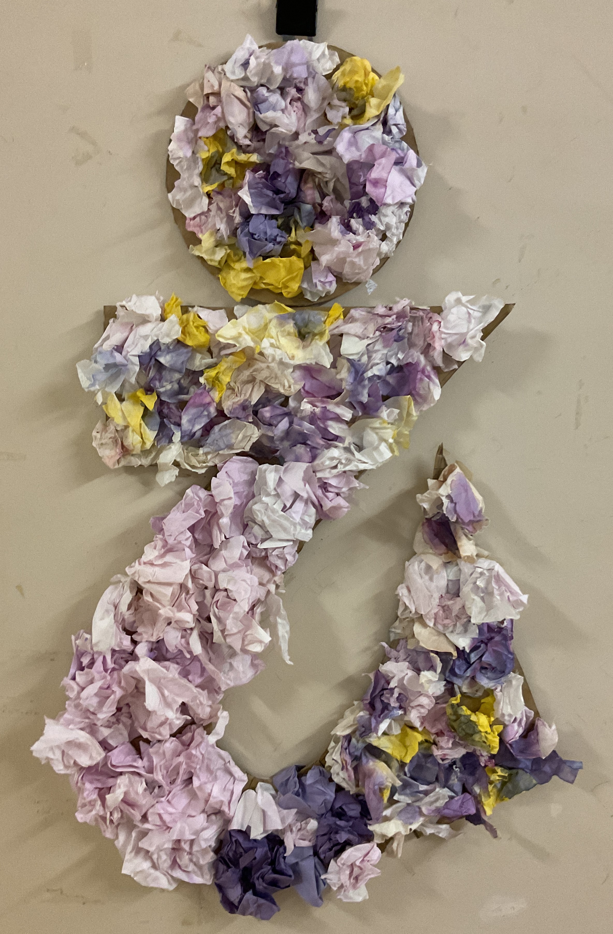 高等部の廊下を歩いていると、やさしい色合いの染め紙で作った校章を見つけました。